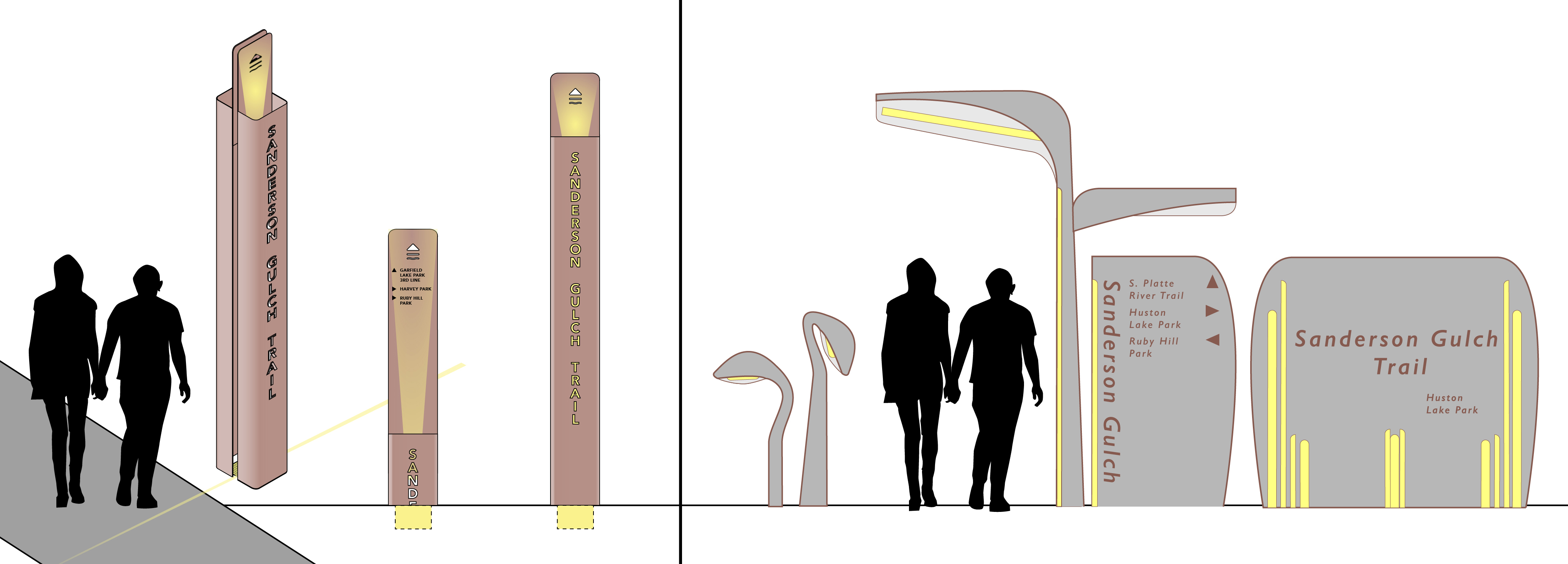 The Sanderson Gulch Trail system identification is based on the history of the area it is situated in from the Arapaho people who first lived here to the industrial development of the gold-rush era. The pallet is based on colors found in nature along the trail and paired together for maximum impact through out the route.